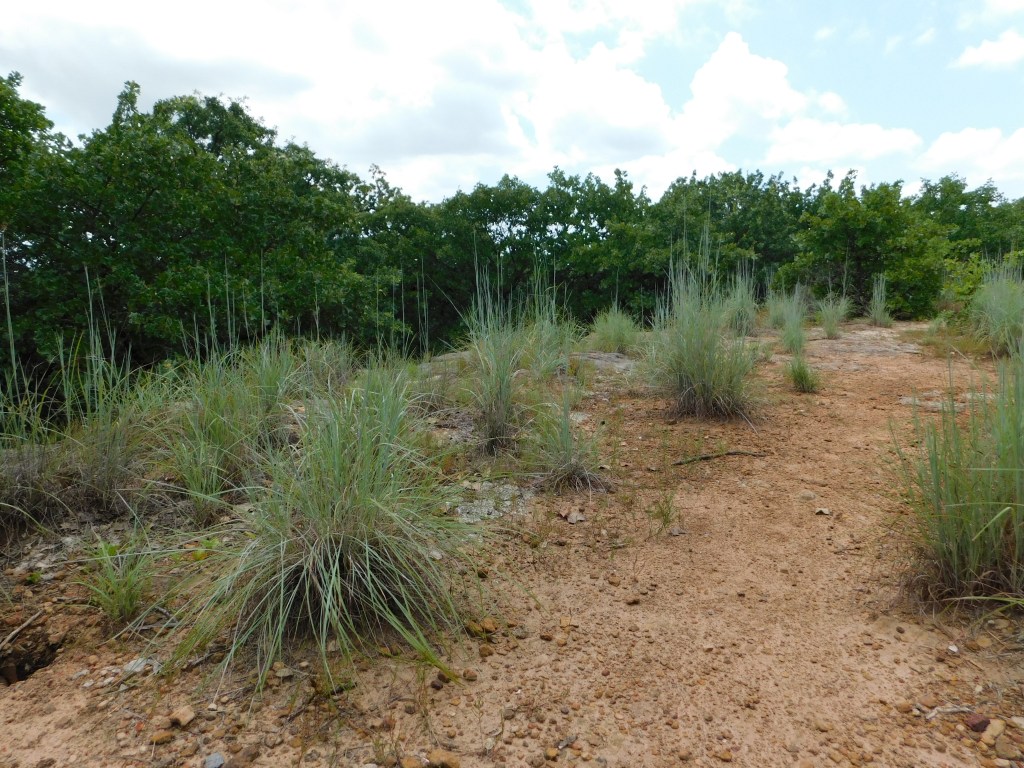 The ridge at the top has a flat, open area where Little Bluestem grows between scattered Blackjack Oak, and the shelf of iron-rich sandstone looks great, if you avoid places where people have carved initials.