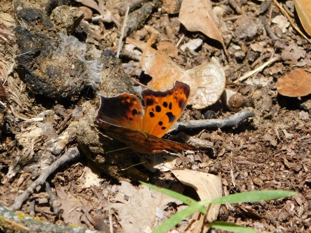On the way back, there were more butterflies, including a beautiful Question Mark, a kind of butterfly that is utterly camouflaged with wings closed but is a beautiful study in orange and dark brown when it opens those strangely-curved wings. It was doing what butterflies do, sipping on a clump of scat. We don’t like to think about such beautiful insects getting nutrition from feces, but there you are.