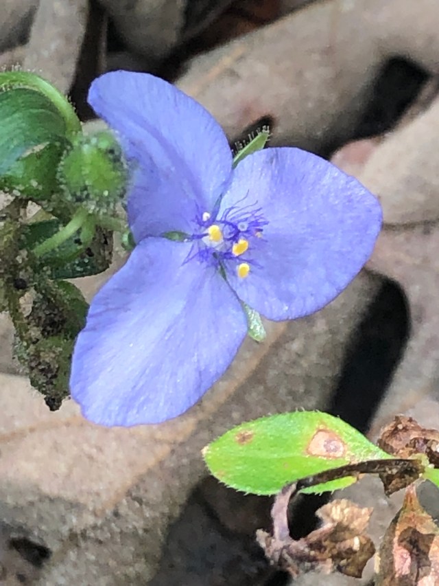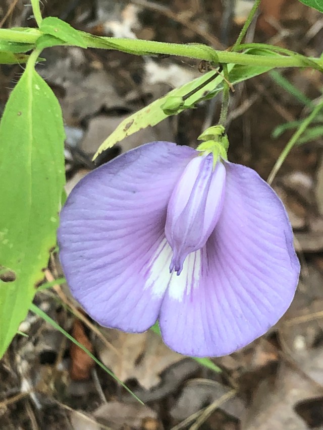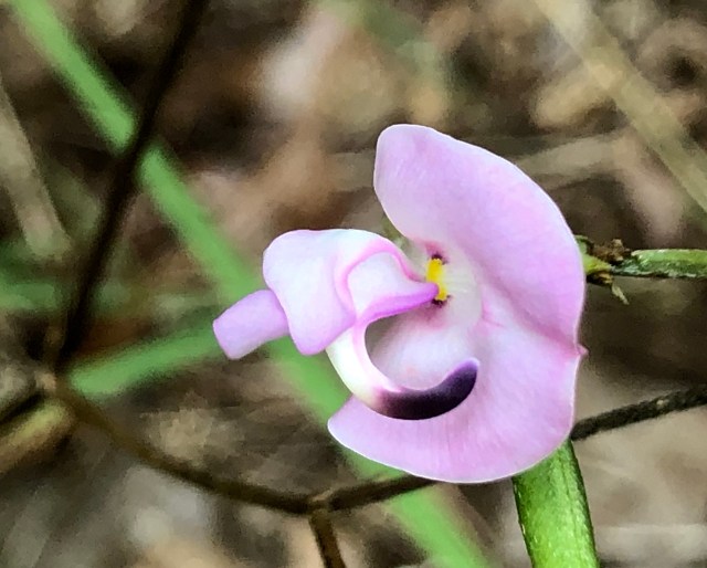 Speaking of looking closely, there was a gorgeous little bloom growing low to the ground here and there in the woods, and you have to stop and really look to appreciate it. Bend down, spend a little time, and notice that it grows on a sort of trailing vine and that some narrow green seed pods are developing. According to iNaturalist, it’s “Fuzzybean,” which sounds like a Sesame Street character but is actually a legume.