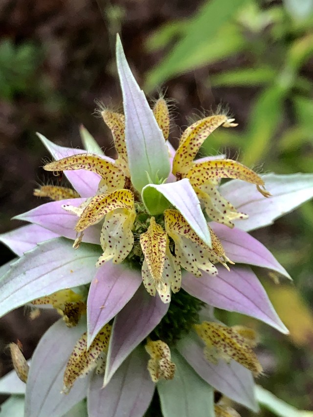 This season, horse mint is growing like crazy in places; in lower areas the purple Lemon Bee Balm is common, and in other areas the Spotted Horse Mint grows in profusion. It’s a nice-looking plant, but if you look closely, it’s a spectacular plant!