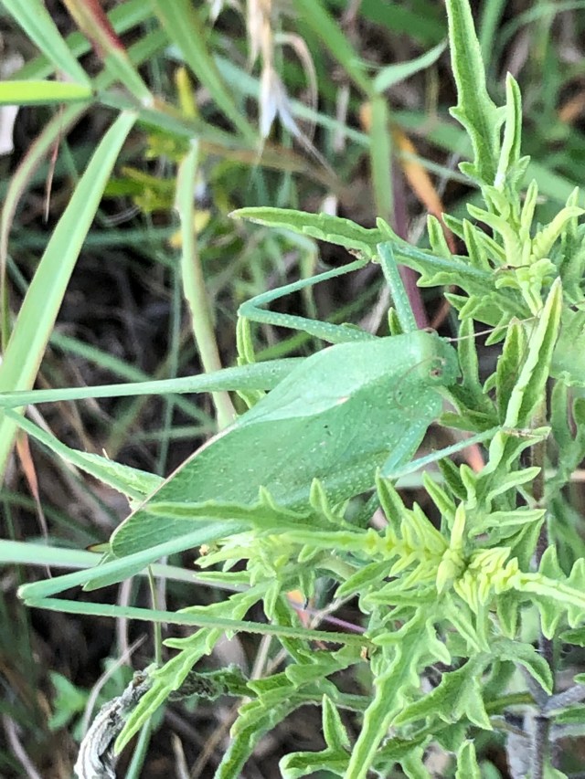Grasshoppers were everywhere, ranging from the slender, slant-faced grasshoppers to big lubbers. I took a photo of a beautiful katydid, which iNaturalist suggests was one of the round-headed katydids.