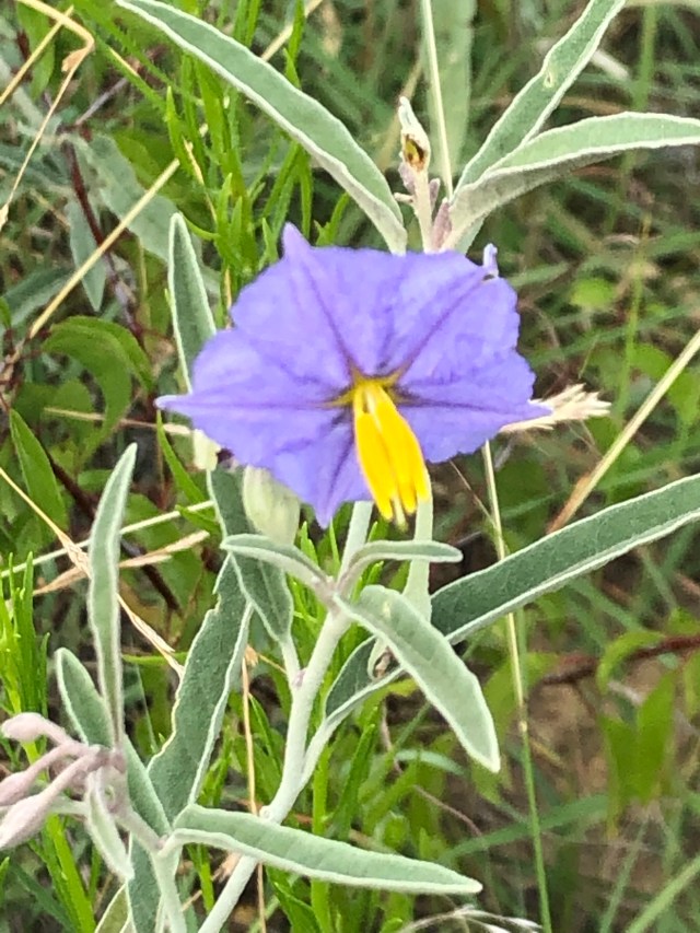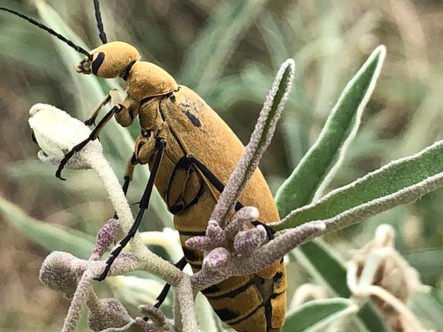 We are also both big fans of Silverleaf Nightshade, a plant with beautiful violet flowers with yellow stamens. The stems and leaves are somewhat hairy, making them look rather pale. They are related to the tomato plant, but the Lady Bird Johnson Wildflower Center describes Silverleaf Nightshade as an “aggressive, poisonous weed.” That doesn’t discourage us in the slightest in our appreciation of this plant. In one location, we found several beetles crawling on these plants, a sort of velvety-tan insect with little or no markings on the wing covers or elytra, but black antennae, legs, and black-bordered segments of the abdomen. Best I can tell, these may have been some sort of blister beetle in the genus Epicauta (thanks, Meghan Rose, for suggesting this identification).