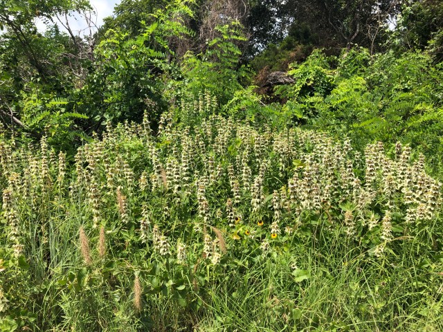 We also saw lots of Spotted Horsemint (aka Spotted Beebalm). Jo is a particular fan of this plant, which is taller and less colorful than Lemon Beebalm, but its whorls of tiny-spotted flowers (in layers alternating with leaf-like bracts that may be tinged purple) are beautiful when examined close up.