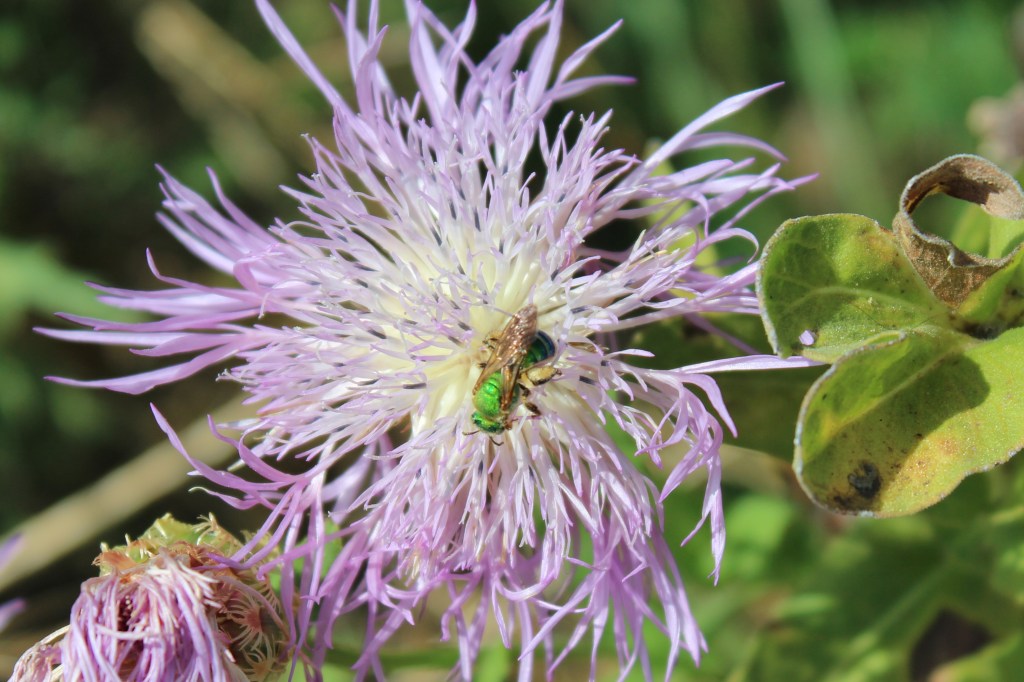 Today there were no box turtles, although I did think about that possibility when we arrived early enough in the morning that the temperatures were very moderate. We didn’t see any snakes, either, but there were plenty of flowers, and the landscape was green and lush after all the rain we have had this spring and early summer. The season of basketflowers and thistles is winding down, though we did see some in places. A metallic green bee was visiting one of them.