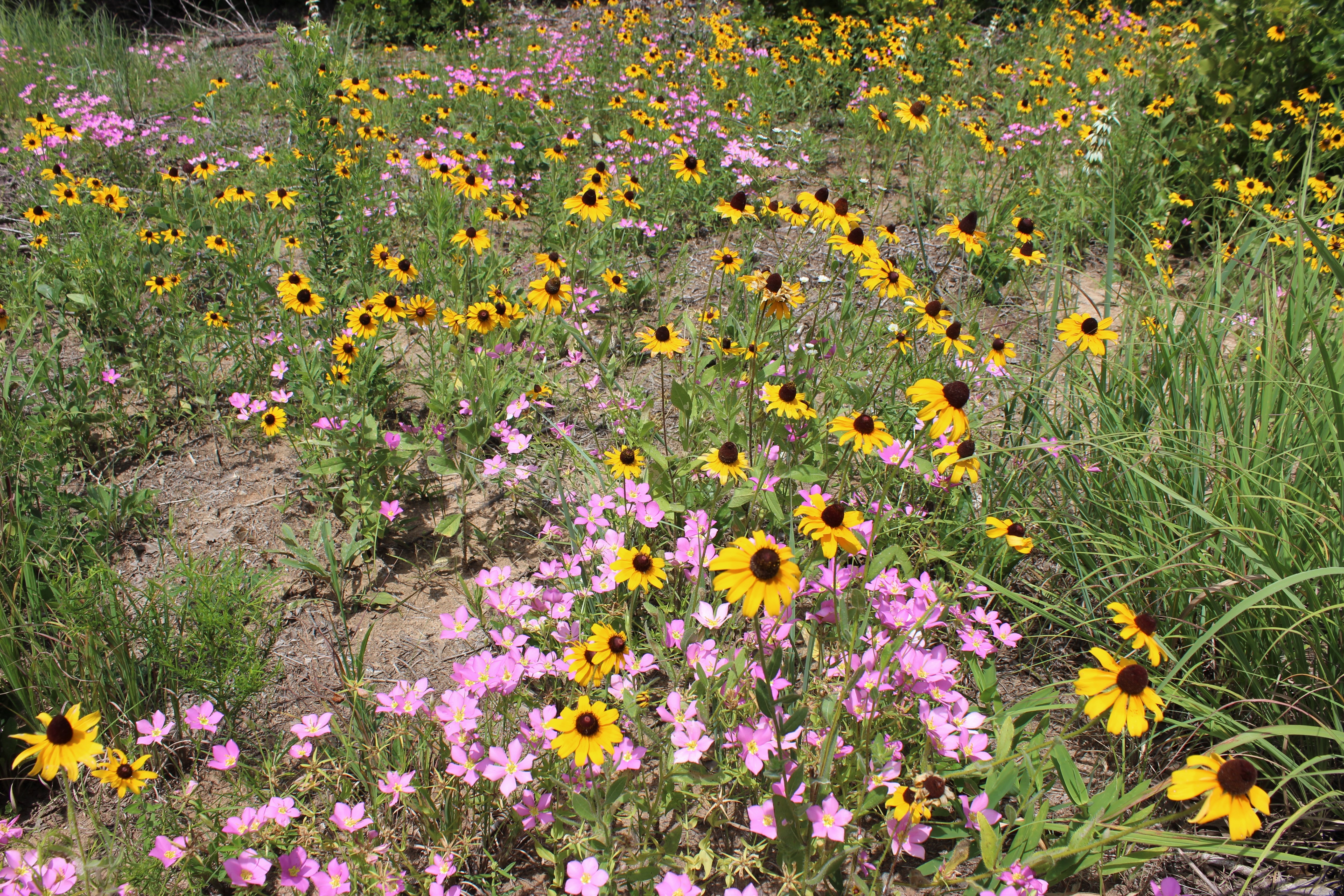 There were also patches of what I imagine were Black-eyed Susan and Meadow Pink, making a beautiful carpet of yellow and pink in some open areas. We saw them at roadside and in open areas near stands of oak, and the flowers made a gorgeous tapestry.