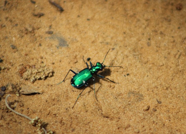 As she started to walk around, she noticed a beetle running along the sandy trail ahead of her. It was brilliant metallic-green from its antennae to the back of its abdomen. It took off and flew a few feet away, and the girl noticed that the green was on the wing covers – called the “elytra.” When the beetle landed, she noticed that six little white spots were scattered on the back half of those elytra. She watched the beetle for several minutes, noticing how amazingly fast it could run on those little legs, and how it flew just out of reach whenever she got too near.