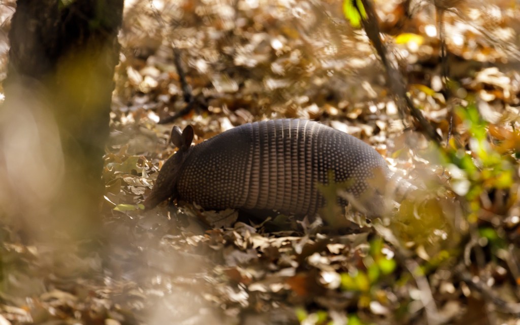 Several times we heard a little commotion in the leaf litter and were able to see an armadillo digging for invertebrates. They stop and probe the leaves and soil, sometimes scratching a short, conical excavation into the soil as they look for insects, worms, and any other animal matter that they may expose. After a short, snuffling exploration of one spot, they move a short distance and try again. David Schmidly’s The Mammals of Texas (Revised Edition) reports that much of their diet is larval and adult scarab beetles, followed by termites and ants, and then caterpillars, earthworms, millipedes, and other invertebrates. A few reptiles and amphibians are taken occasionally, probably examples of small herps being in the wrong place at the wrong time. An armadillo snuffling through the leaf litter can’t be too particular about what they turn up.