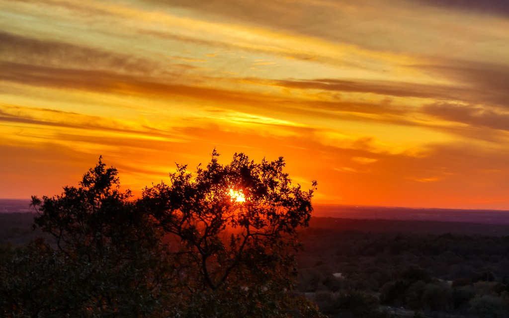At the end of the day, we visited a limestone ridge a few miles away but still within LBJ Grasslands. Instead of Little Bluestem, the grasses here were dominated by a shorter, uniformly straw-colored species surrounding the scattered oaks and junipers. Numerous Grooved Nipple Cacti were scattered on the ridge top, growing in small mounds in the thin soil barely covering the “walnut shell” limestone. Here, we sat and watched the sun set, looking out across an area of woodland and ranch land stretching into the distance. I sat on that limestone, a conglomerate of ancient oyster shells cemented together into gray slabs, and watched the sun make a nearby oak sapling glow red-orange and then darken as the sun was obscured by some bands of clouds. When the sun re-emerged, those beautiful oak leaves glowed brighter. Gradually nature turned down the lights, and those leaves dimmed to dull red. The horizon, however, was still a glowing ember, holding on for a time and painting the undersides of the clouds red and then pink, and then they all faded to blue-gray and closed a very beautiful day in the woods.