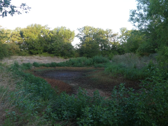 One of our destinations, the smallest pond at the preserve, was a casualty of summer. The water had completely evaporated, leaving concentric rings – an outer one of drying Water Primrose, surrounding an area of cracked, dry mud, with a bulls-eye center of wet mud. The temperature was 74°F and the humidity a steamy 89%. I walked through some of the vegetation and around the circle of dried mud, scaring up grasshoppers but no Blanchard’s Cricket Frogs. The two Jim’s (Domke and Frisinger) and I talked about where the frogs and turtles would have gone. Maybe the frogs dug under the mud, expecting to estivate during a period of drought. In a pond this small, I said I thought that the turtles may have migrated the short distance to the nearest pond with water. I did notice that several seed pods of Halberd-leaf Rosemallow (see the July 18 entry) had dried and cracked open.