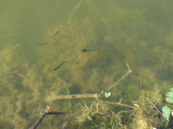 Along the water’s edge, a group of small fish foraged along the surface and among the submerged stems of Water Primrose. These were surely Western Mosquitofish, though I did not net any to confirm it. Their size, shape, and movements all indicated that they were mosquitofish, those surface-feeding fish that feed voraciously on zooplankton and invertebrates, including mosquito larvae. Females grow much larger and bulkier than males and may have a black spot at the back of the body cavity where the ovaries are located. They are not particularly colorful, though there is a bluish iridescence you can see in the right light.