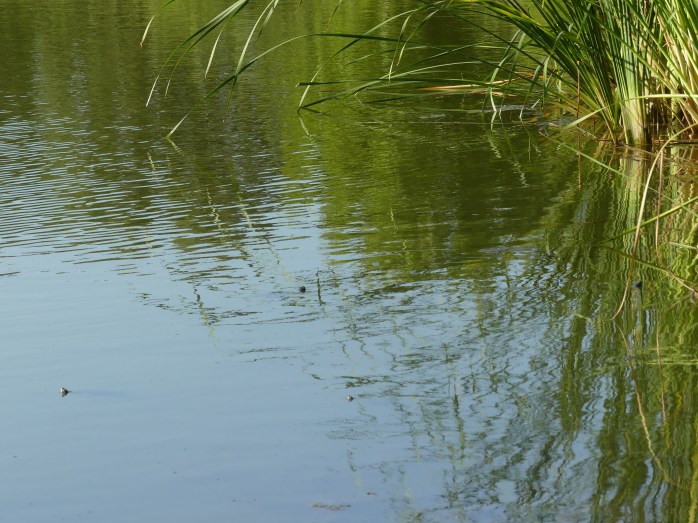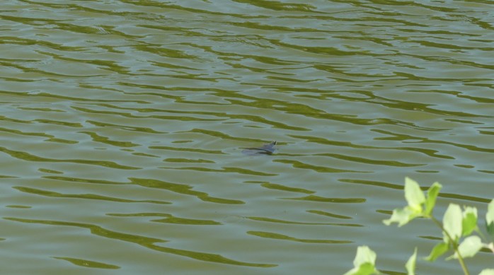 Further along the shore, a turtle in the water just offshore caught my eye. It was that round shell and a curious head shape that grabbed my attention, and it did not hang around for a photo. It must have been a softshell! I was sure I’d seen a snorkel nose and a pancake-shaped shell – and then it returned to the surface to breathe, staying just long enough for me to take a quick and rather poor photo. It was fairly small, either immature or a young male (females grow quite a bit larger). There is only one other iNaturalist record of the Spiny Softshell at the preserve, and this was another!