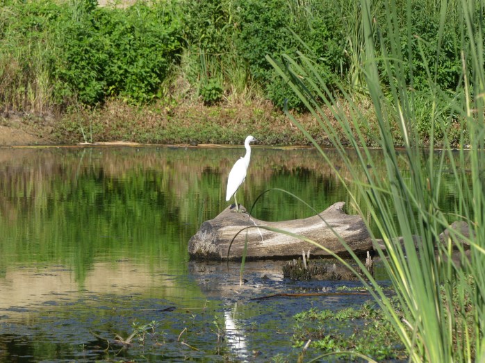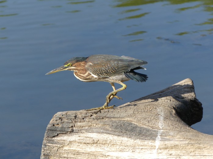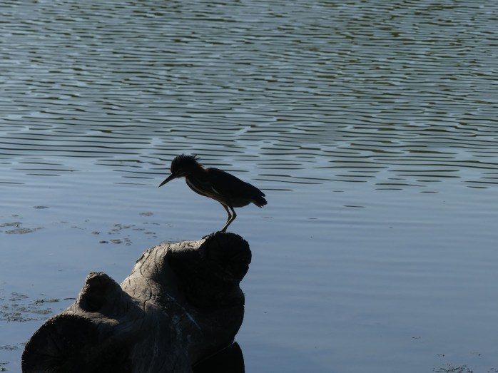 That observation made this a really successful survey walk – what could be better? Well, a really fine bird observation would not make it better, but it would sure round out our walk in a beautiful way. On the walk back, we saw a couple of Great Egrets again, standing in their tall, bright white elegance along the shore. And then, after they had flown, a smaller bird flew in to take the place of the one who had been standing on a log in the water. His crest of feathers suggested a young man with a Mohawk on his way to see Green Day perform Jesus of Suburbia, as he landed on his log and eyed us with suspicion. His Mohawk flattened and he began to look at the water around him, periodically glancing up at us just to make sure he wasn’t going to have any trouble from us. He (or she) was a Green Heron, maybe a young bird whose brown and white streaked chest had not filled in from the sides with the reddish-chestnut brown of an adult.