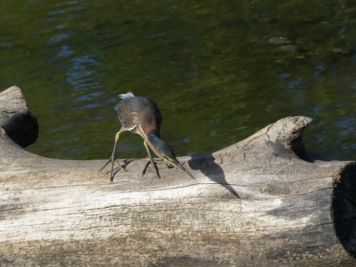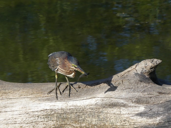 This heron was surprisingly tolerant of three old guys hanging around, two of them taking photos. While we watched, he hopped down as low as he could get on the log and watched the water intently. We waited – he waited, and then there was a quick stab of his long bill into the water, bringing back a juvenile sunfish. Was there a hint of a self-satisfied smile on that long beak, and a glint in his eye as he looked up at us? Probably not, but his skillfulness was impressive. In fact, the Cornell Lab of Ornithology tells us that these birds sometimes even drop bits of bread or insects on the water to lure a fish in close enough to be caught.