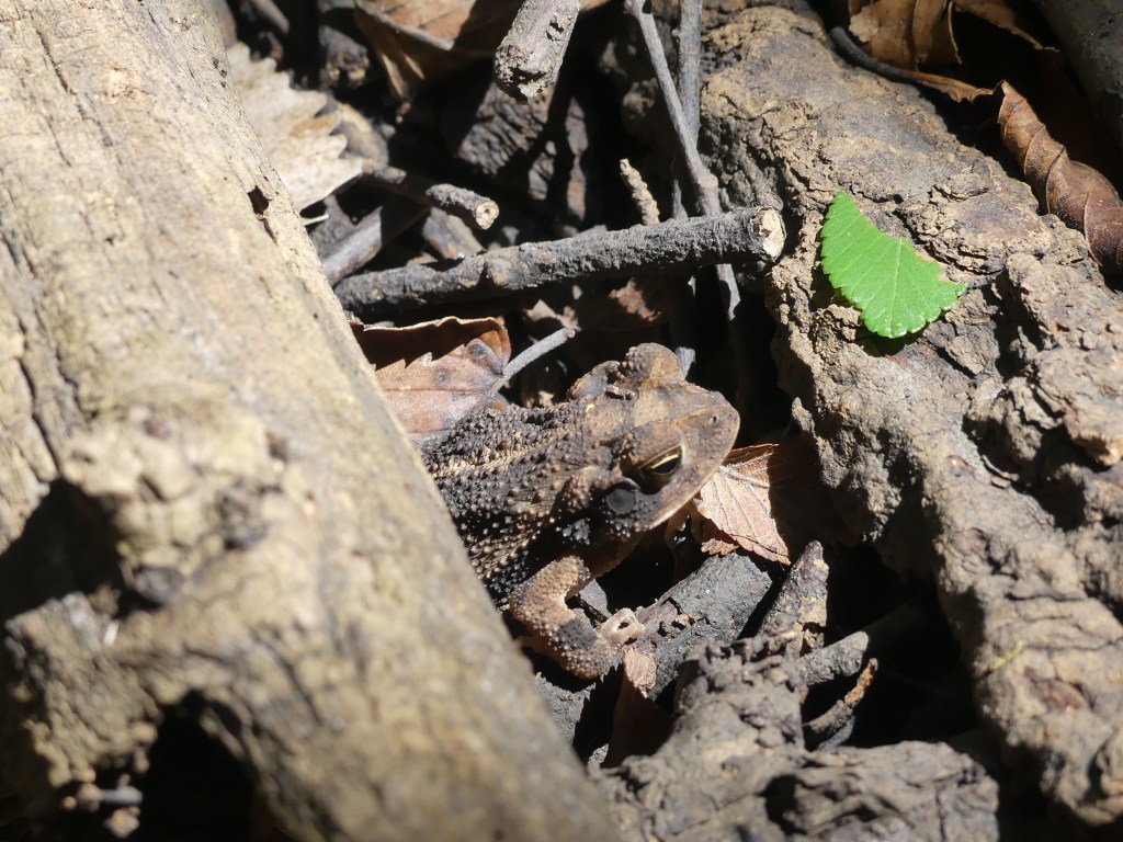 The really common amphibian was the Coastal Plains (aka Gulf Coast) Toad. We found many of these, ranging from very small metamorphs – just recently transformed from tadpoles – to young toads that were not fully grown. Dustin McBride, a Nature Center staff member who was with us, could make out the tiny identifying marks such as the shapes of parotoid glands better than I could. As they grow, these little toads develop a characteristic dark pattern with a light stripe down the back and dark bands down the sides, with very prominent cranial crests (bony ridges on the head) and raised parotoid glands behind the eye and eardrum that are fairly triangular in shape.