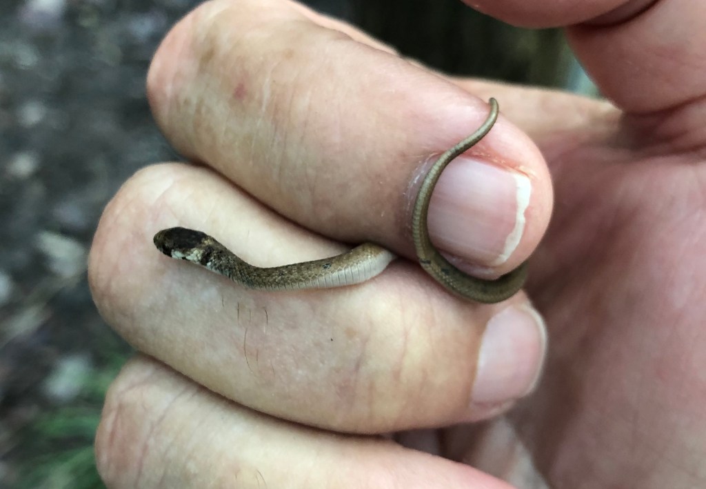 Not all of the herps to be found in the bottomlands are big and charismatic – as a matter of fact most of them are small creatures with a small-scale repertoire of traits and skills with which they go through life. One of them is DeKay’s Brownsnake, previously known as the Texas Brown Snake. It is a fairly nondescript brown-colored snake that grows to about a foot long, with a faded brown stripe down the middle of the back and a suggestion of little dark spots down the back on either side of the stripe. Babies are live-born, and unlike the adults they have a light collar of cream-colored scales just back of the head. August appeared to have been the due dates for these snakes throughout the bottomland, because we found several of the roughly four-inch babies.