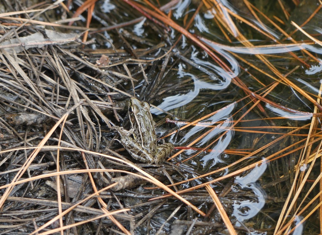 On the final part of our walk, back through the pine grove, we spotted a watersnake slipping over the banks of one of the ponds and into the water. I got enough of a look at its body shape and especially its movement to know that it was a harmless watersnake. While cottonmouths can move quickly, they never seem to have the grace and speed of a watersnake. While this one immediately slipped beneath the water, a cottonmouth would typically (not always!) ride along the water’s surface, more focused on looking around it or simply sitting still. A watersnake fleeing danger usually swims at high speed, along the bottom, until it finds a place of concealment where it can wait for danger to pass.