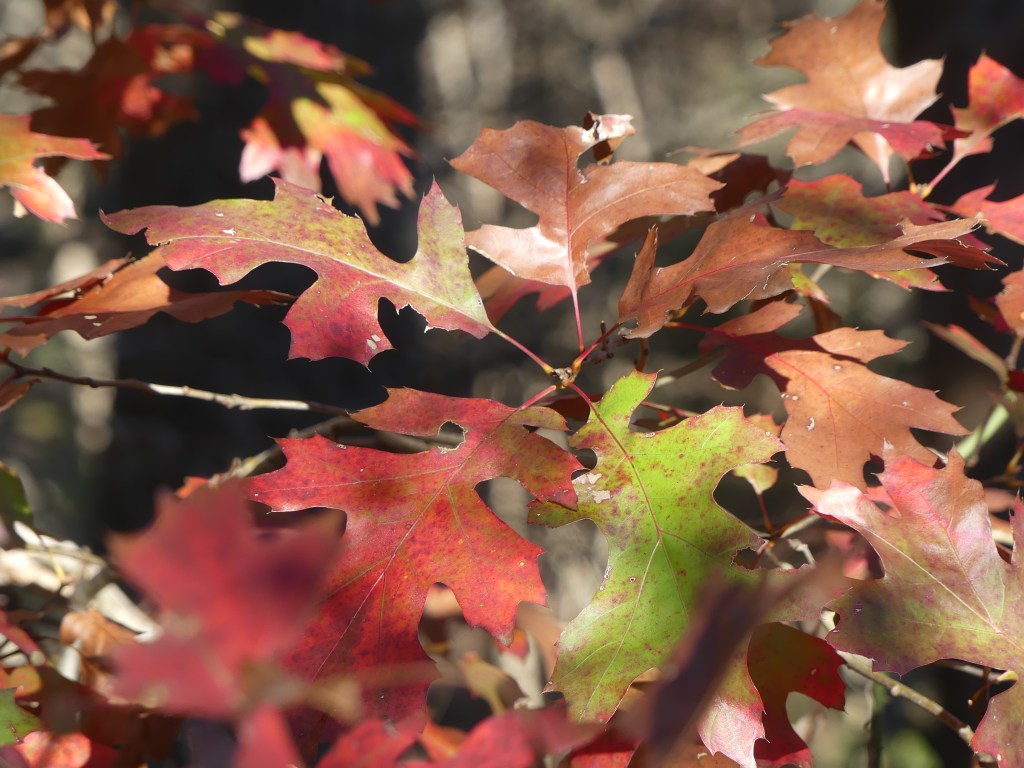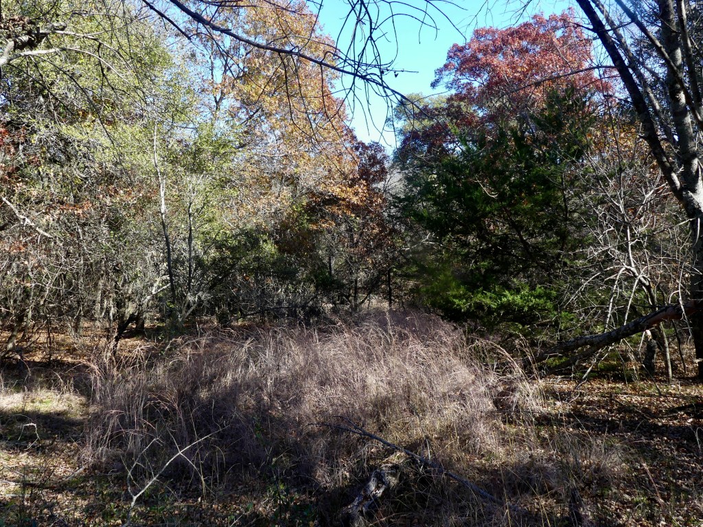 It seems to me that the Cross Timbers is not usually a place with spectacular fall foliage on a grand scale. Most years, you appreciate the more subtle loveliness of the woods, and you find small patches of colorful leaves. That is what we found today. The woods were beautiful in shades of brown, rust, and straw, and in places the leaves were bright red and green.
