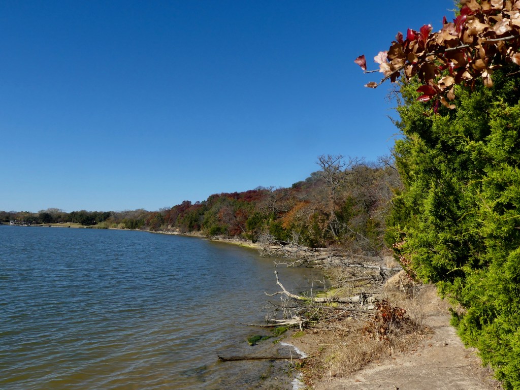 We reached a point where we emerged at the shore of Eagle Mountain Lake, and stood watching a few gulls flying and a group of American coots paddling on the lake surface. Nicky found a branch with a pretty fair resemblance to Gandalf’s staff in the Lord of the Rings movies, and he traced a number of runes into the trail surface. “Ash nazg gimbatul!” There’s much fun to be found on a walk like this.