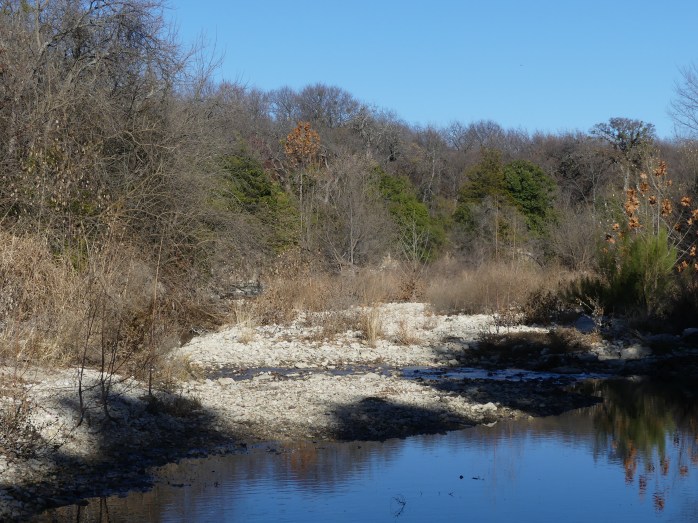 When I returned after Christmas and four days into winter, once again it was clear and warm. I walked the trail up through woodlands to that spot where a live oak overhangs a bench that looks over a little patch of little bluestem grasses. It is one of several places I am strongly drawn to at the refuge. I got there a little after 2:00pm, and my field notes included these entries: It is breezy – even windy enough to shake the treetops in a sort of slow motion way. The bare tops of oaks and other trees stiffly swayed as if nodding greetings all around.