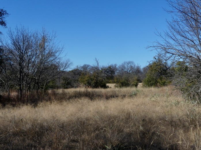 When I returned after Christmas and four days into winter, once again it was clear and warm. I walked the trail up through woodlands to that spot where a live oak overhangs a bench that looks over a little patch of little bluestem grasses. It is one of several places I am strongly drawn to at the refuge. I got there a little after 2:00pm, and my field notes included these entries: It is breezy – even windy enough to shake the treetops in a sort of slow motion way. The bare tops of oaks and other trees stiffly swayed as if nodding greetings all around.