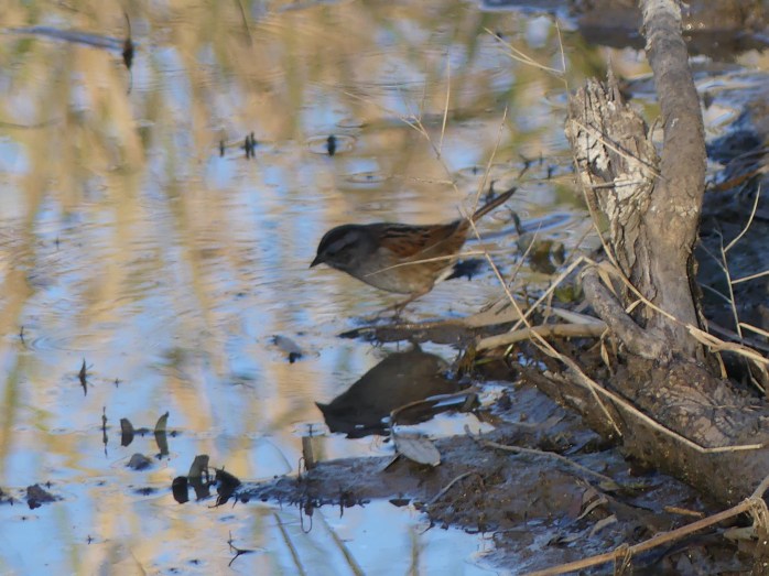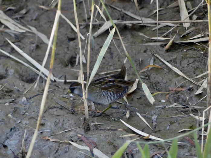 Closer to us, at the muddy margins of the marsh, we were amazed at the birds that kept popping up in front of us or down below the boardwalk. One species entirely new to Barbara and me was a sora, a secretive marsh bird that tends to stay among grasses and reeds looking for seeds and aquatic invertebrates to eat. There was also a swamp sparrow hopping around the water’s edge, and a common yellowthroat.