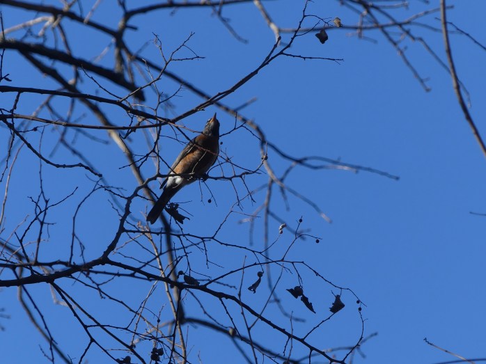 I walked back through some woodland to get a look at a favorite patch of savannah. As I walked through the woods, I saw the only substantial bird life of this day – birds that mostly included the American Robin, moving from place to place eating berries from vines and mistletoe.