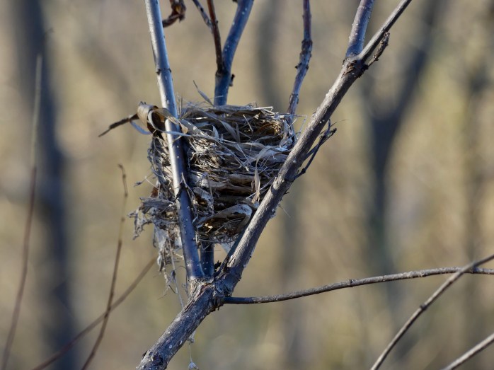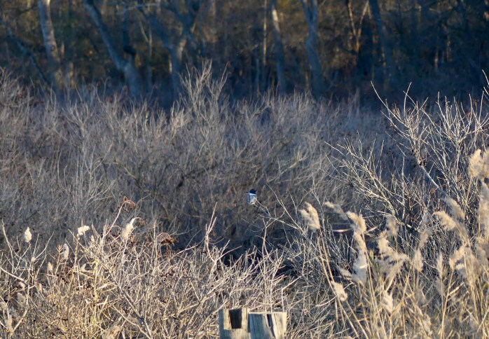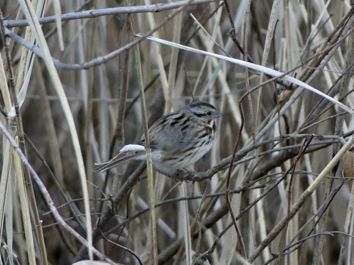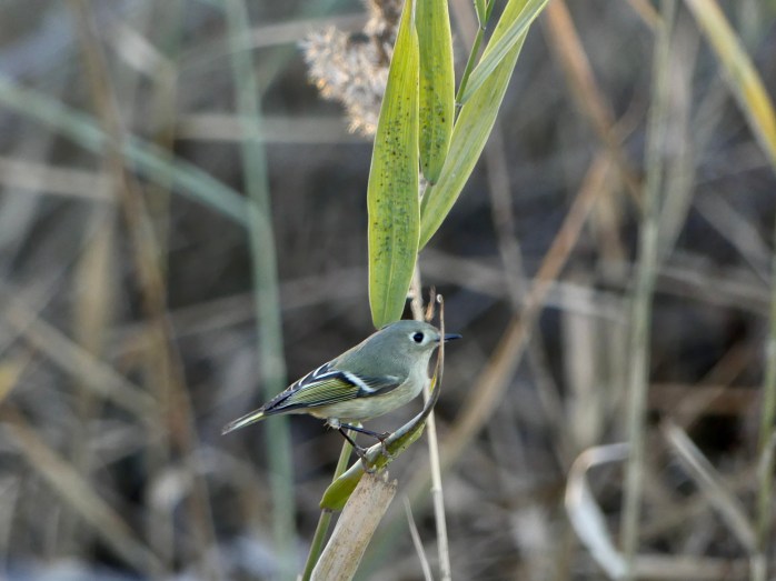 Higher up in the Phragmites stems was a handsome song sparrow, although the photo I was able to get hardly did it justice. And higher up, flitting among tree branches and the tops of the reeds, was a ruby-crowned kinglet. These are gorgeous little birds who don’t sit still long, although they’ll spend long enough at my suet feeder for me to get a good look, sometimes even seeing the little red patch of feathers on the crown of the head that gives them their name.