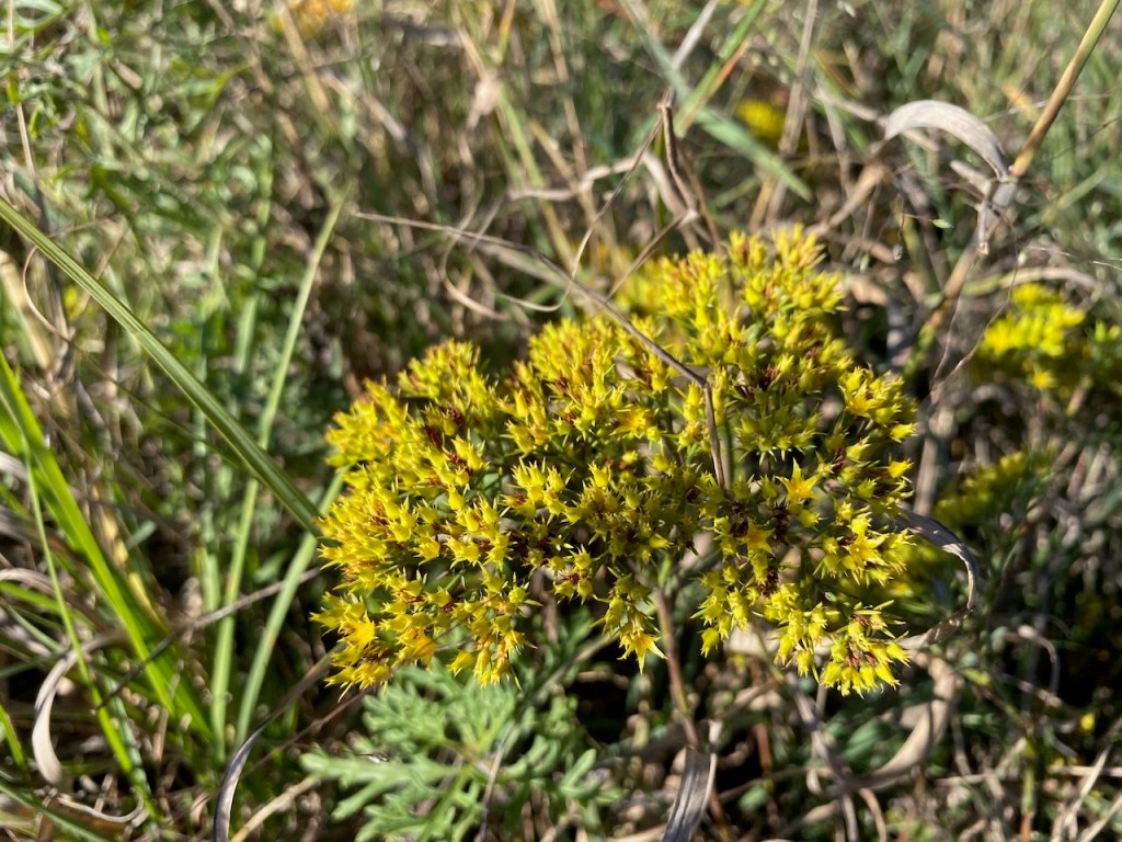 We started the walk with examples of big bluestem and Indiangrass, two grasses characteristic of north Texas and among the tallest. Soon we came across a low-growing plant with mats of yellow flowers, identified as Whitlow-wort. Our prairie experts considered it a great plant, associated with healthy prairies.