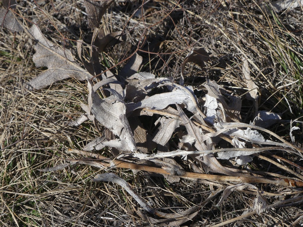 There are some spots within open patches of prairie where the sun exposure, drainage, and surrounding community of species is just right for the compass plant. Its name reflects the tendency for the leaves to grow facing north and south. Not that the plant cares much for cartography, but when the leaves grow in this way, they do not absorb so much of the sun’s heat in summer. And what leaves! Compass plant leaves are big and deeply cut into lobes, and the leaf is very stiff and sandpapery. Even in winter when the plant is dormant, the dead leaves persist on the ground as pale ghosts of their summer selves. They are brittle but still stiff and gritty.