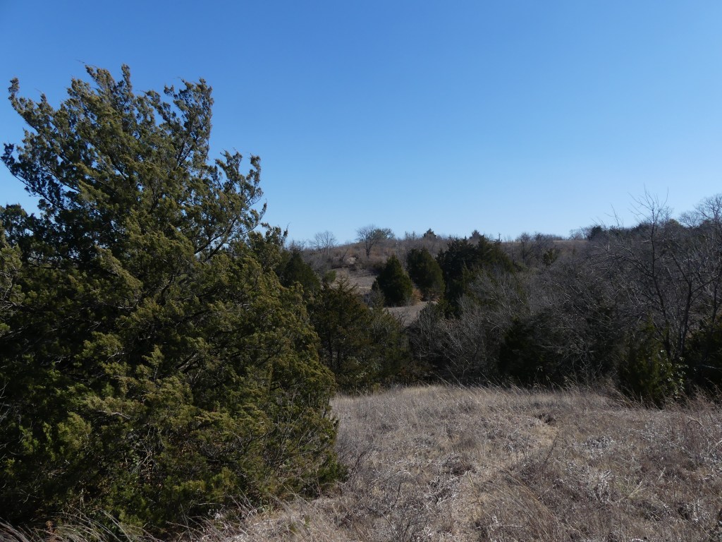 Eventually I sat on a bench on one side of a ridge and looked across junipers and oaks to a small tree or shrub around a hundred yards away. It had a smear of reddish color, perhaps leftover autumn leaves or a possumhaw with clusters of red berries. I wanted to focus my awareness on my breathing and on this one spot in the distance. Bringing attention to each breath is a way, in mindfulness practice, to let go of distractions and focus on moment-to-moment experience.
