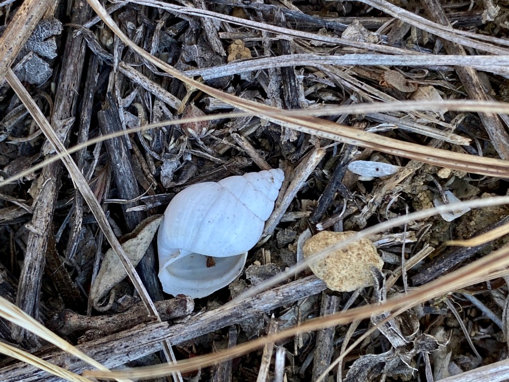 Sometimes my pace resembles what Suzanne Tuttle calls “walking at the speed of botany.” Being unhurried and shifting between the wide view of the landscape and the narrow view of small patches of ground, you find wonders hidden in plain view. For example, there were the small gleaming white shells tucked away in the thatch of last year’s grass. The land snail called Rabdotus generates a beautiful spiral shell, growing bigger as the curve expands below its conical tip.