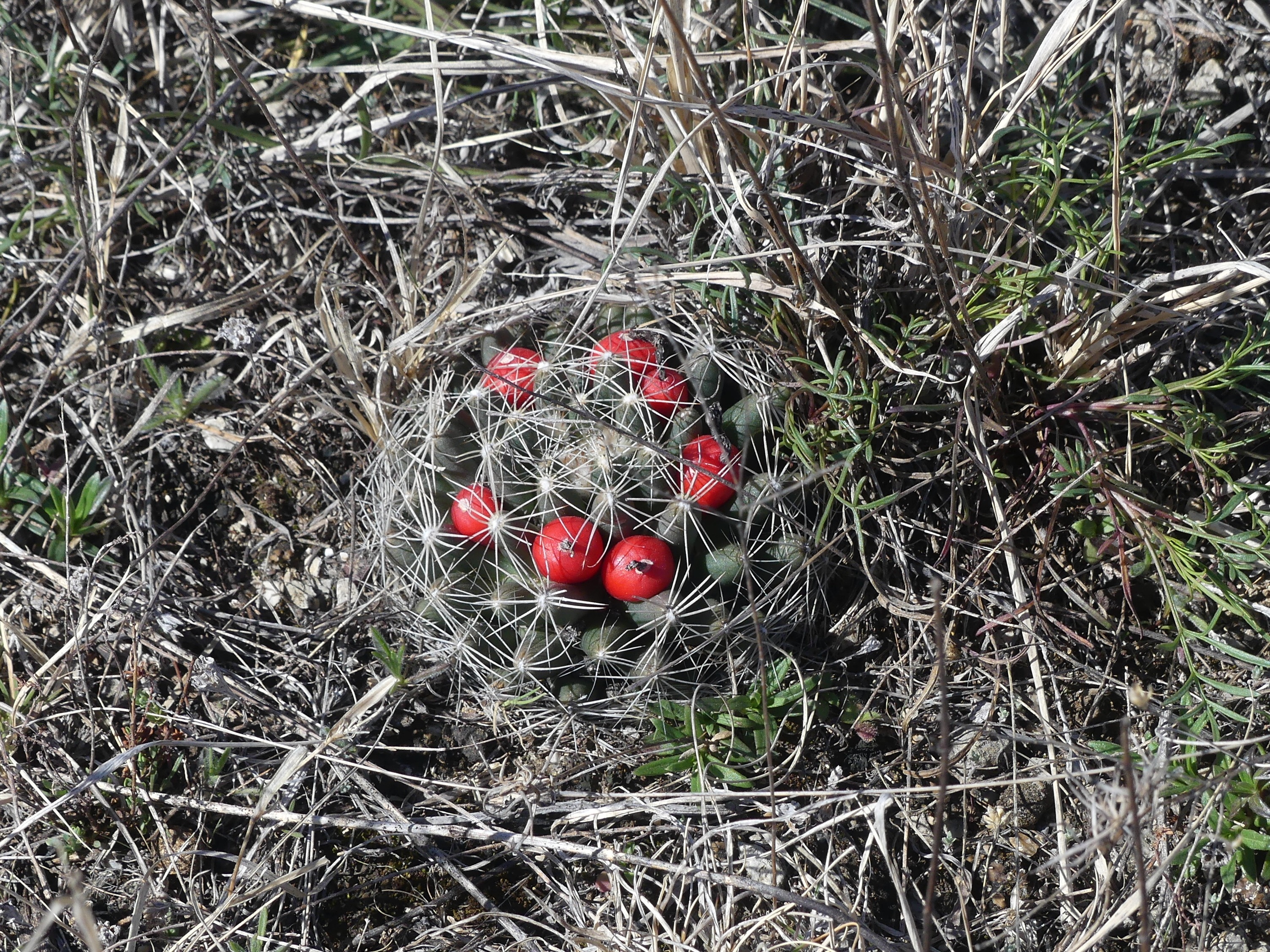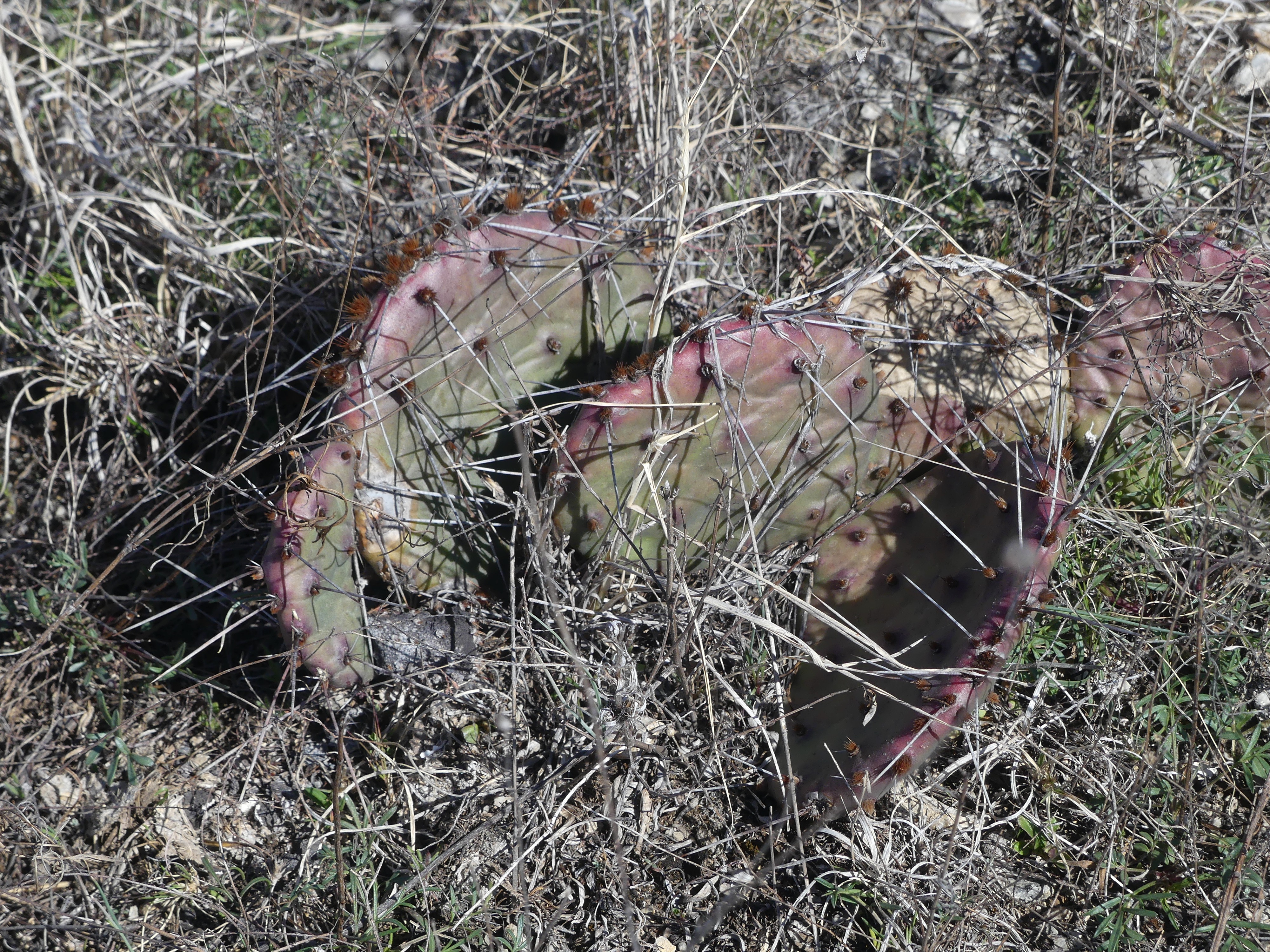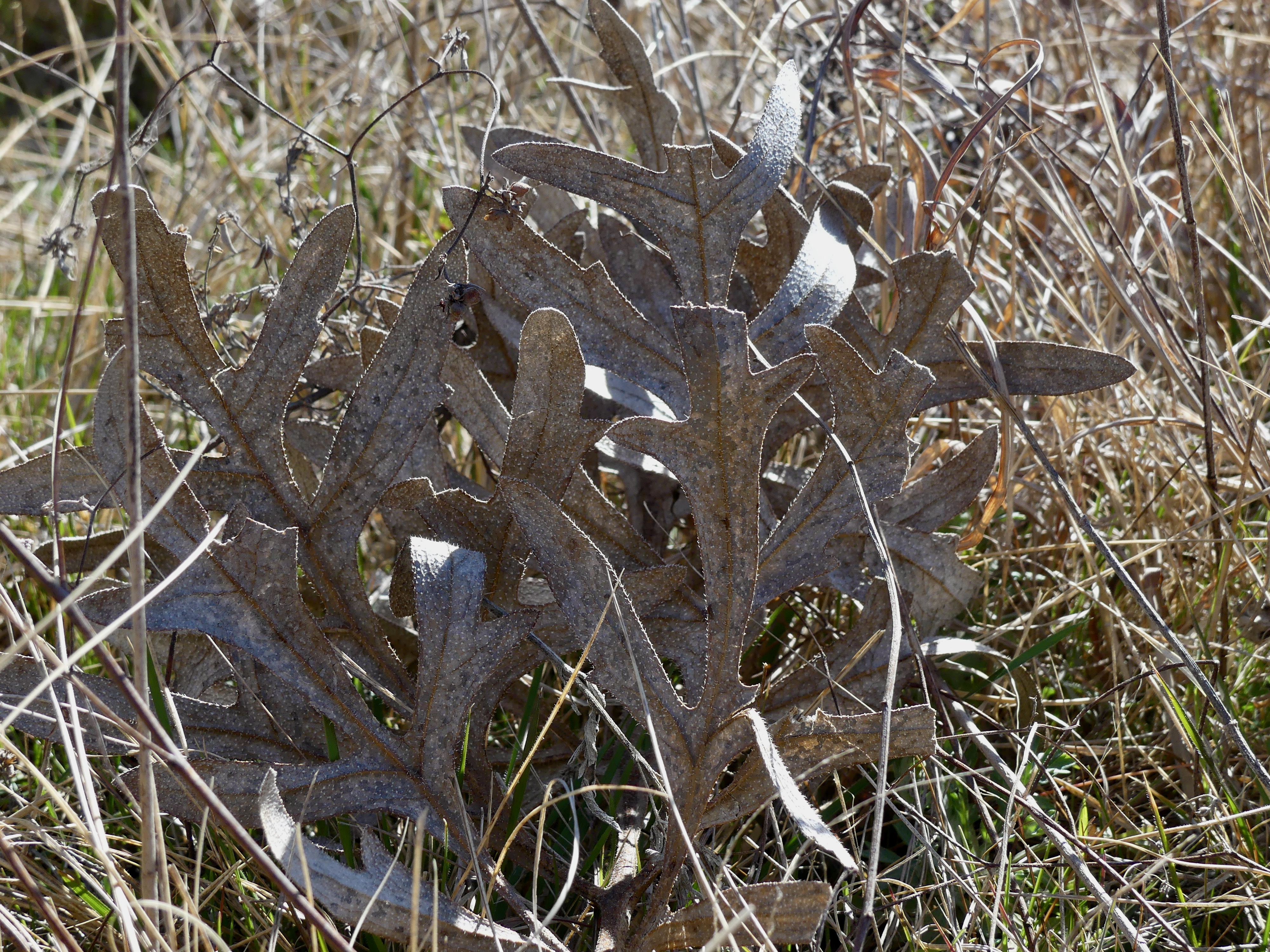 On the top of the cuesta, prairie grasses grow where the soil is deep enough. In shallow soil, even in areas with bare limestone, you can find clumps of cacti such as the grooved nipple cactus with stems like rounded domes covered with spines. There are also prickly pear cacti whose pads in winter are colored in shades of faded brick red and pink. Elsewhere up on the ridge there are clumps of compass plant. I love those long deeply notched leaves that feel as if they were cut from stiff sheets of sandpaper.