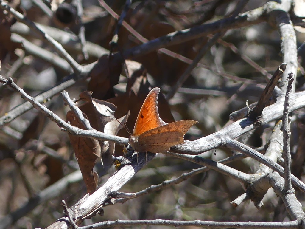 Throughout the winter the sulphur butterflies persist and dance across dormant prairies and sunny glades, but today more insect life was awakening. In one spot I began to see orange butterflies. At the edge of a clearing, two of them encircled each other and seemed to catch an updraft, swirling straight up to the crowns of the surrounding trees. When one landed, I saw that it was a goatweed leafwing. Their deep orange wings are scalloped, edged in ashen gray and the forewing and hindwing come to points. Their interesting name is based on description and natural history. The host for their caterpillars is “goatweed” or croton, and when closed the wings look just like a dead leaf.