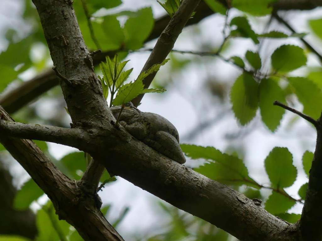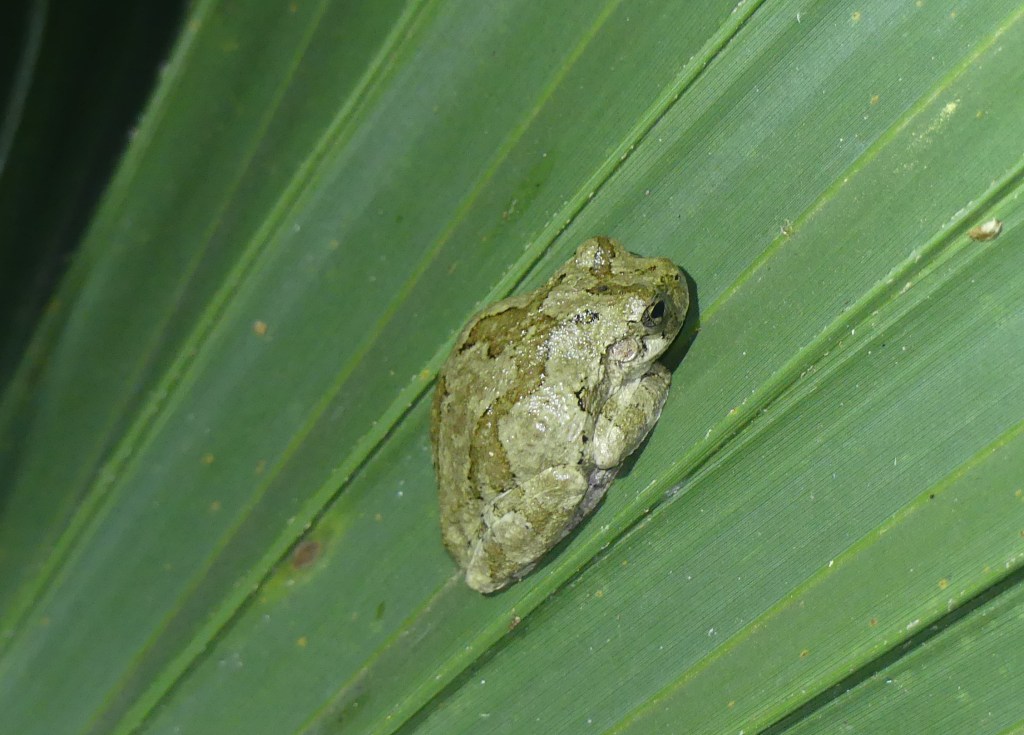 We heard the frog, but finding it was something else entirely. Ruthann looked in nearby branches – it is a treefrog after all, and we usually find them hugging a branch or the trunk of a mid-story tree. The frog called again and Ruthann resumed her search, but these treefrogs are masters of ventriloquism. It seemed to be close and everywhere at once. Finally she found the frog, a little lump on a branch about eight feet above the ground.