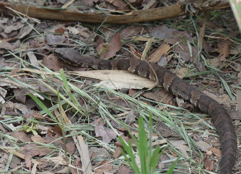 As we walked along one of the trails, a couple of park staff approached on a Gator. They stopped ahead of us, intently focused on something at the edge of the trail, a sure sign of something Ruthann and I would want to see. It was a young cottonmouth, no doubt surprised to be surrounded by admiring humans. We were happy to see that the park guys were very protective of the little snake, and we took a few photos while explaining that we would never harm the cottonmouth. We watched the pretty little reptile turn back and slip under the palmetto fronds.