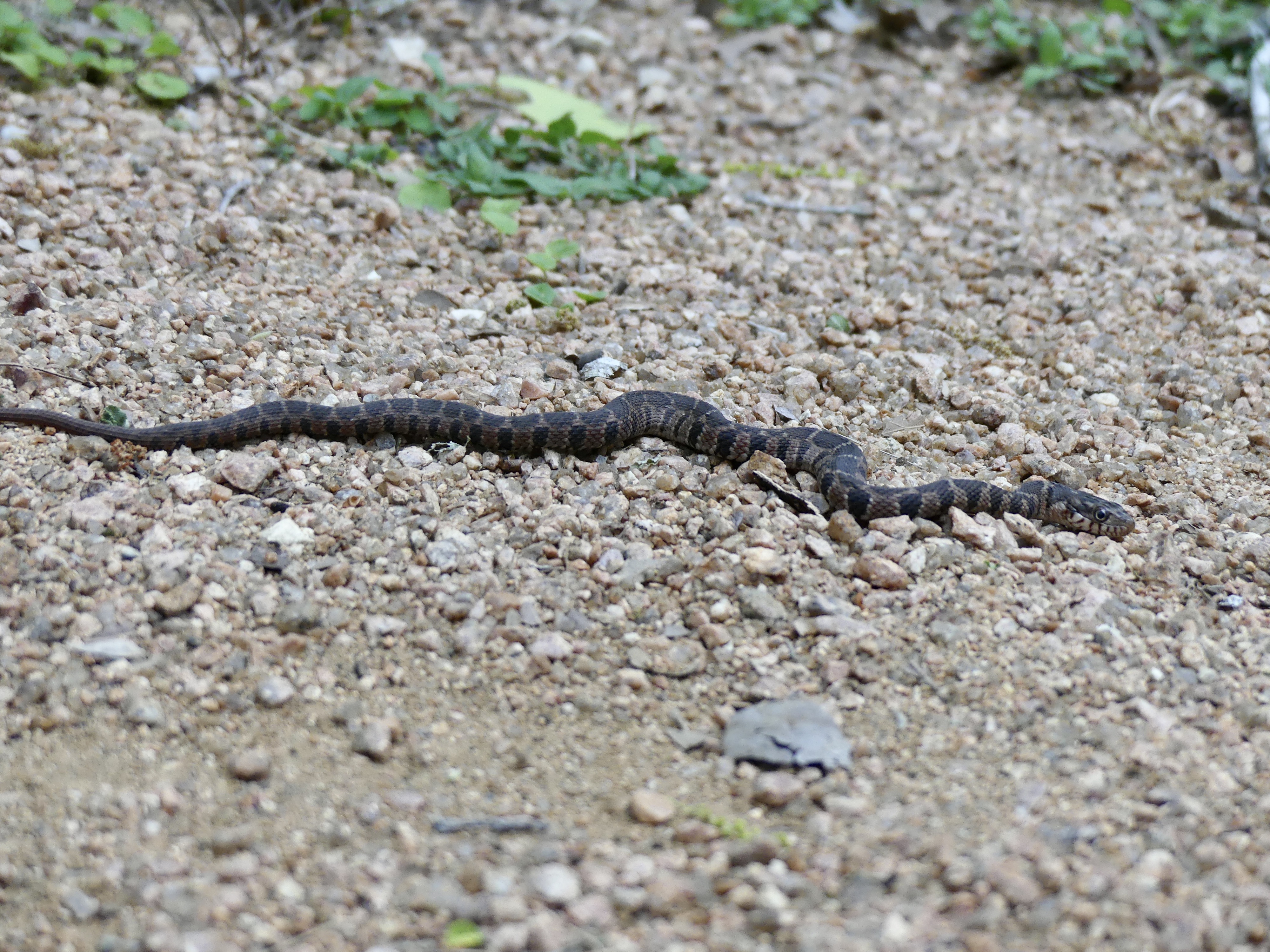 After a break, we returned to the trails as evening approached. One small squiggle caught our eyes, motionless on the crushed granite trail. A baby plain-bellied watersnake, born just last year, hoped that we would not notice a squiggly “twig” lying on the ground, even though the twig had scales and a somewhat banded pattern. I took a photo or two of this “twig” and then Ruthann scooped him up, now a fully animated snakeling struggling to get away. Nothing doing! Ruthann had to examine and talk to the scaly bundle of cuteness before releasing him to go on his way.