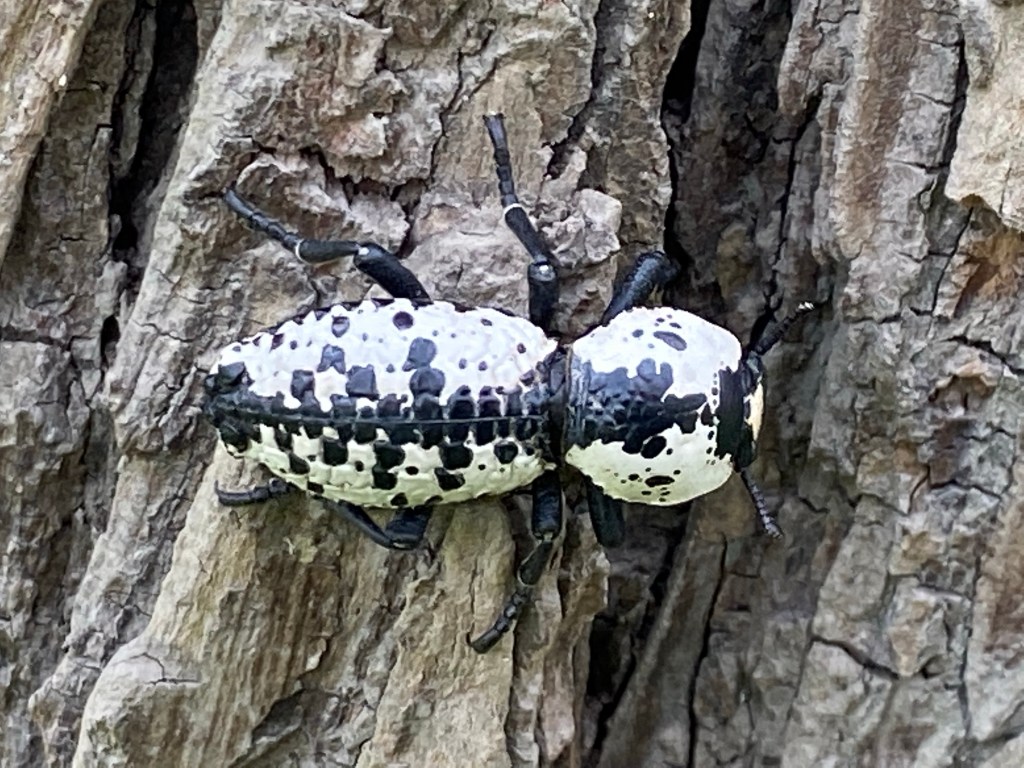 As the afternoon progressed, our discoveries included a Texas ironclad beetle. It looks like a cream-colored beetle that was splattered with black paint, and its claim to fame is that its exoskeleton is really, really hard, justifying the name “ironclad.” Internet sources such as the Field Station of the University of Wisconsin say that you would not kill it by stepping on it. Please don’t try that out in the field – this is a harmless, attractive beetle that just wants to go on its way munching on lichens as it roams around tree trunks or fallen branches.
