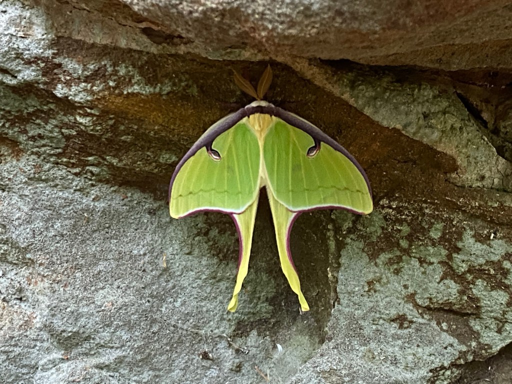 Most of the luna moth’s life is spent as a green caterpillar. When it emerges from the pupal stage as a mature moth, it will complete its life in a very short time, so short that it does not even have a functioning mouth to eat. Females release a pheromone to attract males; they take flight in the darkness and some time after midnight they find each other and mate. During flight, the long trailing hindwings are said to interfere with bats’ ability to find them by echolocation.