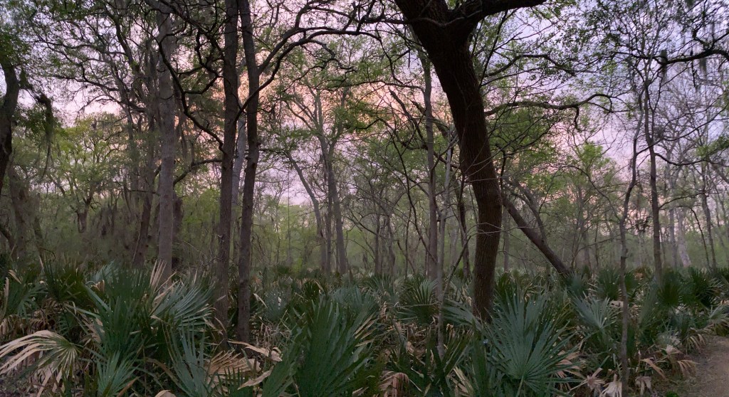 This might be a difficult night for flying. As sunset approached, the breezes became strong winds, making the tops of the trees sway drunkenly back and forth. Gusts sometimes carried dust and grit through the woodland, and it occurred to me that we might wind up dodging falling branches. The sky became rosy and golden, giving this palmetto swamp a magical sort of glow.