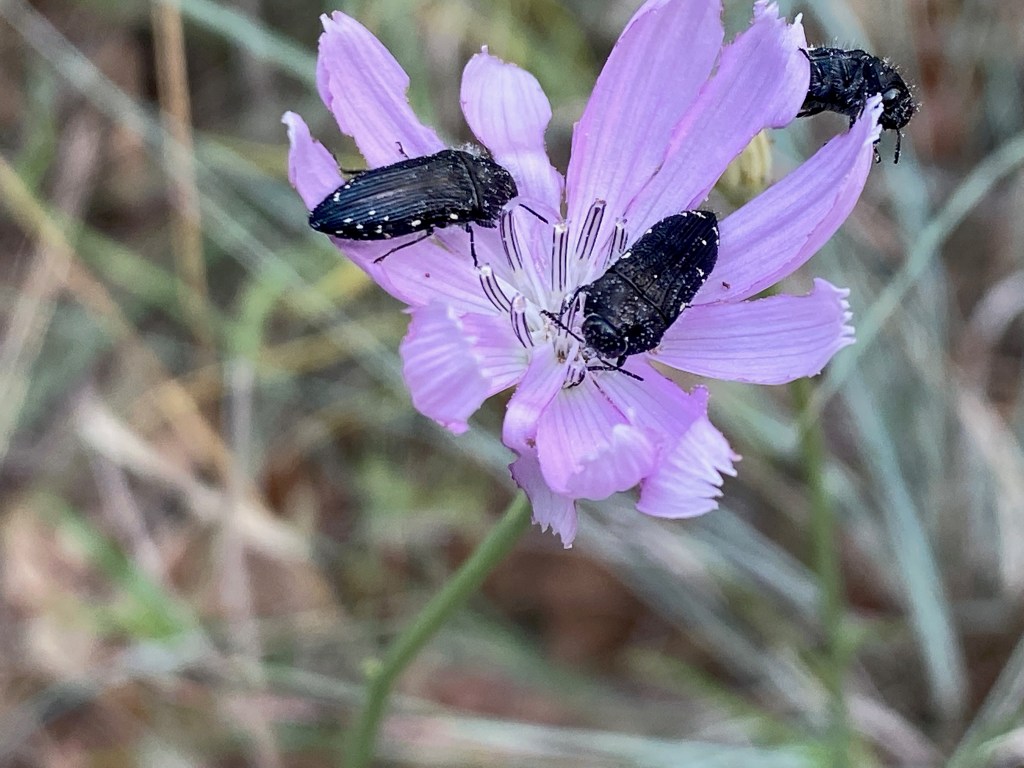 The first thing I noticed were a few scattered slightly purple-pink flowers on slender stalks; Texas skeleton plant, according to iNaturalist. Each of these flowers had several small beetles rummaging around within it. They appear to be a species of metallic wood-boring beetle (the larvae may be wood-boring but the adults seem to love flowers). This place is very familiar from my winter visits but it was delightful to find out how spring changes it. There were other plants – tall wooly whites with their clusters of flowers and a plant with clusters of long, oval leaves with red stems extending up into the central leaf vein.