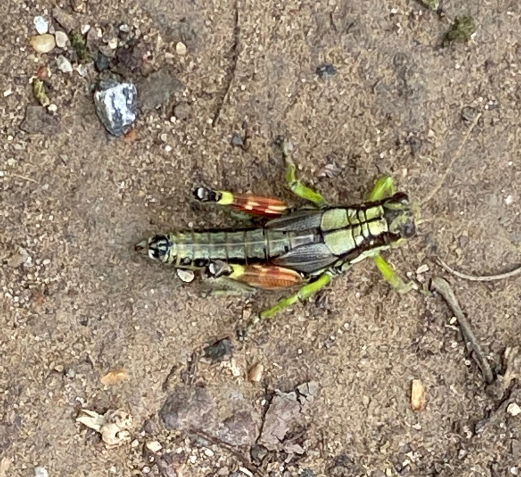 I also found a new grasshopper, identified by iNaturalist as a post oak grasshopper (and there were certainly post oaks nearby). Green and black striped bodies with orange and yellow back legs – wow, what a beautiful insect!