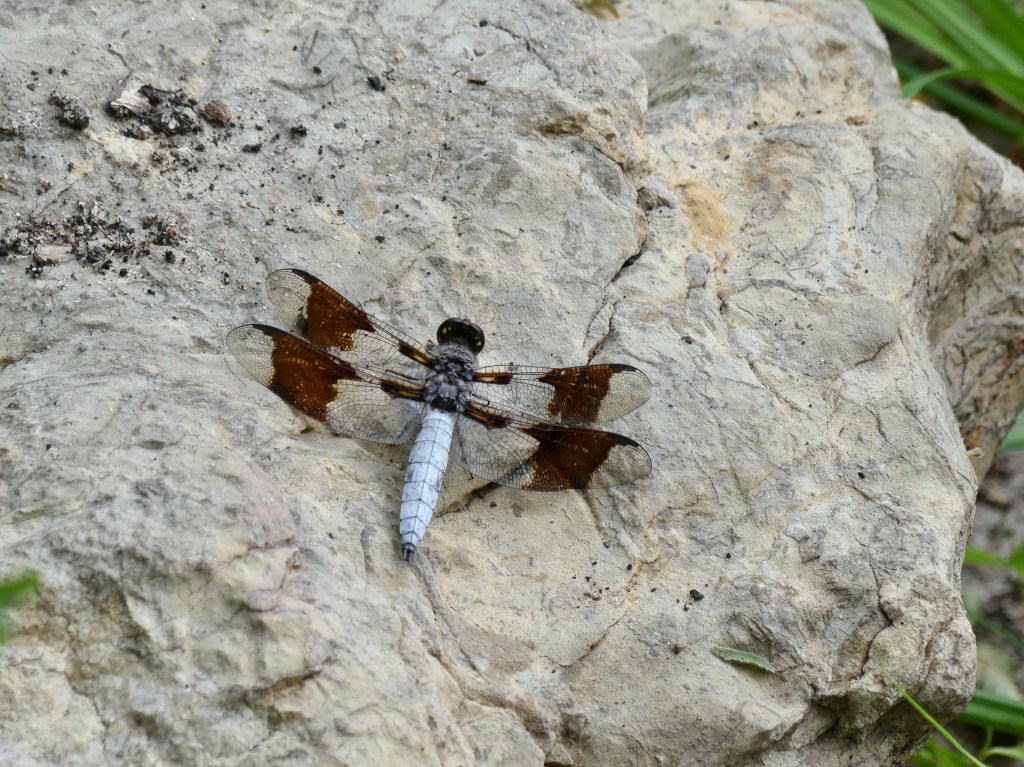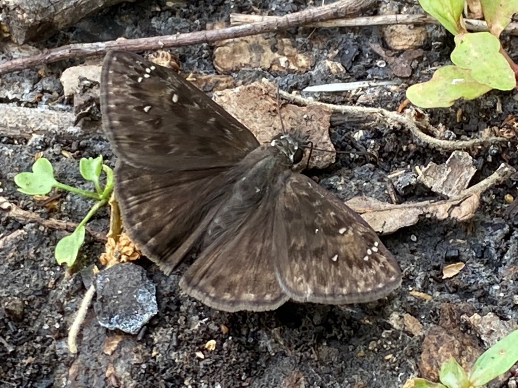 I followed the trail to the edge of the marsh, past a twenty foot tall dead tree whose bark had the appearance of being twisted, as though earlier in its life something grabbed it and gradually twisted it as it grew. There was also a hole, very much suggesting a woodpecker’s cavity nest, but it was only about seven feet off the ground. At the water’s edge there were dragonflies and a handsome brown duskywing skipper to see.