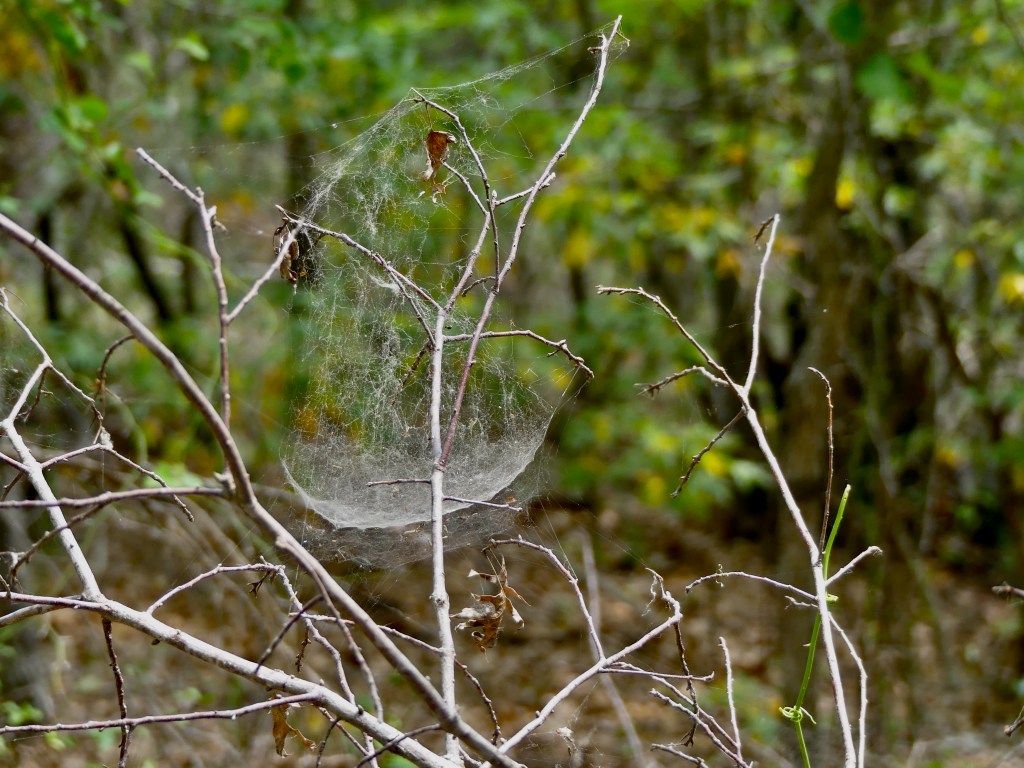 There was another road to walk, the familiar old path down into the bottomlands. The giant cottonwoods and other trees were like the pillars of a giant cathedral, and the place was full of life. One of the things I noticed was a bowl-and-doily spider, a small woodland spider whose web looks like a bowl suspended over a flat, old-fashioned doily.