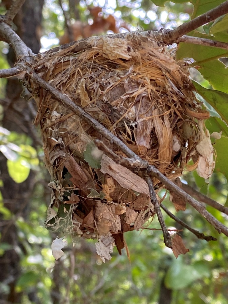 We followed one of the trails leading away from the ponds and into oaks, junipers, and pocket prairies. Jim found a small pouch of a bird nest hanging from the delicate ends of tree branches. We spent some time appreciating all the different materials that had been gathered and woven into this little cup. There were bits of leaf, lichen and grass creating a sturdy little shelter for a delicate egg and a tiny bird who embodied both engineering skill and attentive nurturing of new life.
