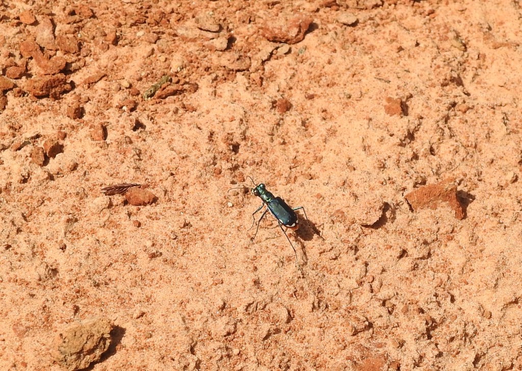 All along the prairie openings, grasshoppers jumped out of the way. They were a welcome sight after the prolonged drought that might have reduced their numbers and left so many animals without food. And we saw tiger beetles foraging along the sandy trail. Evidently there were enough smaller insects to keep those fierce little predators fed, too.