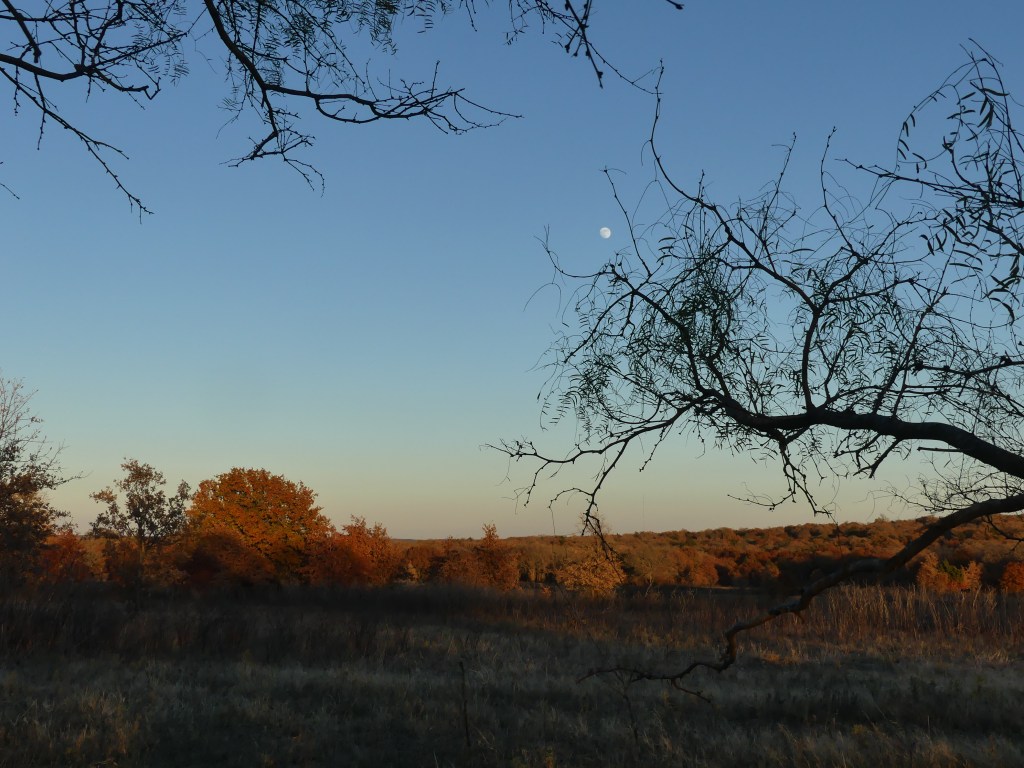 Late in the day, I walked in Unit 76 where there are big open areas of grassland and a few more mesquite trees in higher, well-drained places. The sun was getting lower and the shadows longer. I sat under a mesquite looking across a patch of prairie at a line of oak trees lit by the setting sun. The rest of the landscape was darkening, and the world was still. A nearly full moon was rising in the east, and I watched it climb in the sky framed by mesquite leaves.