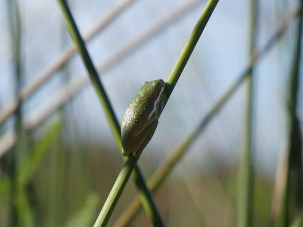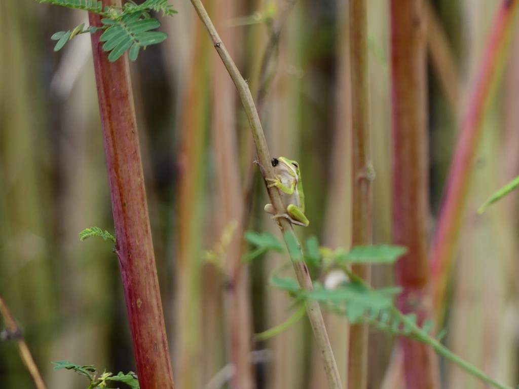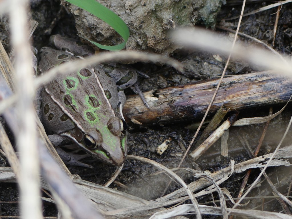 But earlier we had seen several species; they were present but not breeding. People in the group saw leopard frogs, and then we found a small green treefrog. As we watched, it spotted an insect, then jumped, caught it and gulped it down. More green treefrogs were seen, and Alex found a juvenile western ribbonsnake and a couple of cricket frogs. Sheryl found a Gulf Coast toad.
