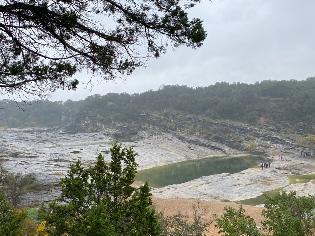 We headed south, full of optimism that the sprinkles and mist would not get in the way of a good walk at Pedernales Falls State Park. Being in good company outweighs getting wet, and after the drought we have been going through, none of us were complaining. When we arrived at the park the river was softened by a little mist and the trees were dripping. It was going to be great.
