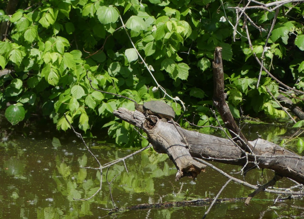 One of the turtles basking over the water was clearly not a cooter or slider, but my camera lens was not pulling in enough detail. Caleb took a look and said he thought it was a musk turtle, and with the head and neck more visible in his photo I agreed. It appears to be a razor-backed musk turtle, a small turtle with a carapace (top shell) a little like a peaked roof. Such turtles are on the menu for lots of other animals, including that alligator we had seen. As a result, they are pretty wary and I’m a little surprised that this one didn’t drop into the water before we could take a photo.