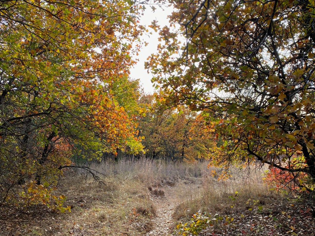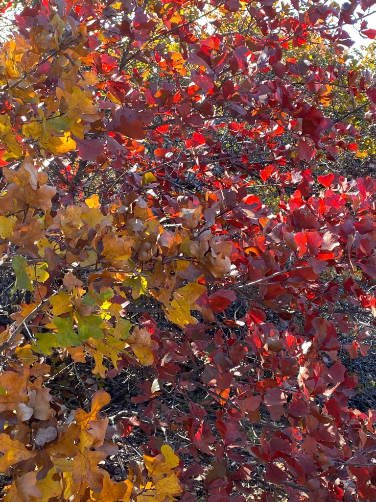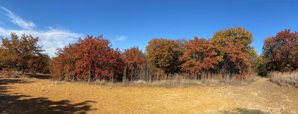 It was a beautiful vision to carry with me as I walked through oak woodlands and on trails along patches of prairie that are lovingly being restored. Some of the blackjack oak leaves have taken on a shade of alizarin crimson, and tonight, if the sky is clear enough, we might look up to see Prussian blue.
